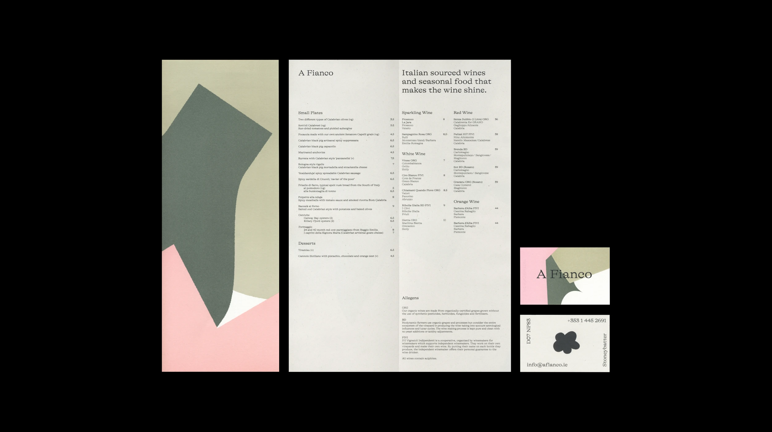 After previously working with Roberto and Carol on Grano, we were thrilled to partner with them once again for the branding of A Fianco β a charming neighbourhood vineria nestled in the heart of Stoneybatter, offering an abundance of exciting Italian wines.