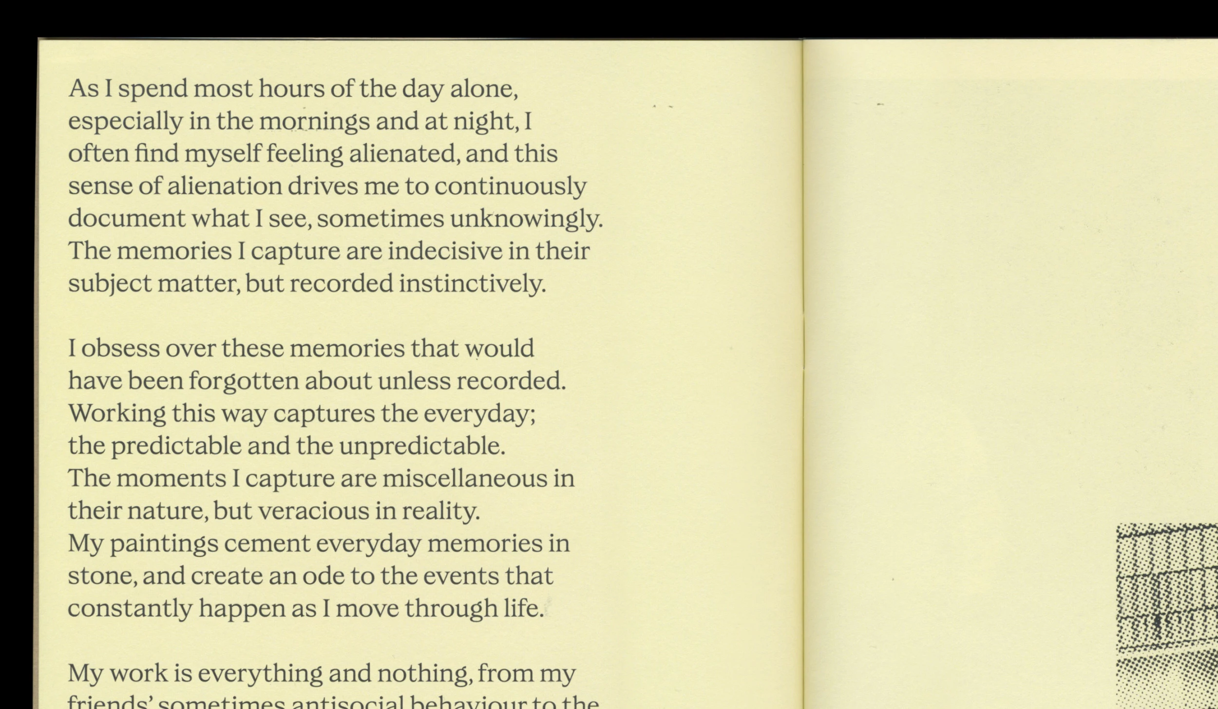 Driftwood Editions is an independent publisher producing limited editions of work they find interesting worldwide. It is an ongoing colloboration between ourselves and photopgrapher Rich Gilligan. For this edition we published a body of work from painter Carl Hickey. This series of paintings were painted by Carl for his degree show exhibition in 2022. Photographed by Rich and re-published in book form in 2023.