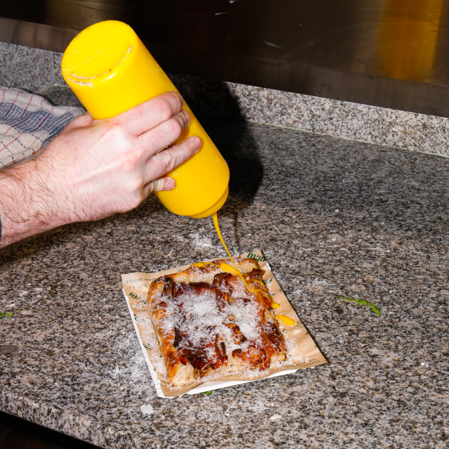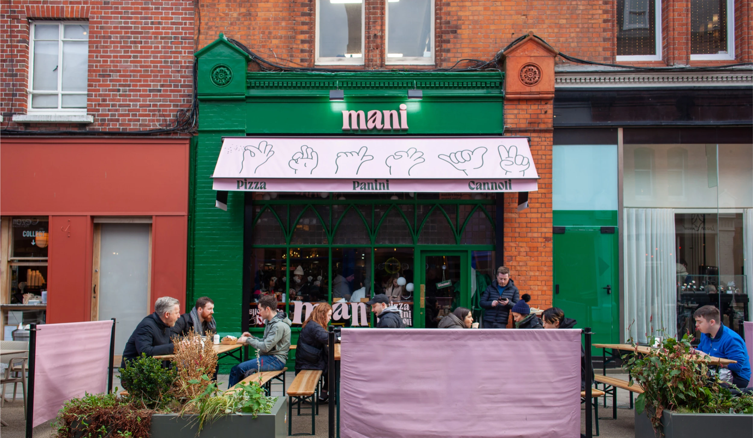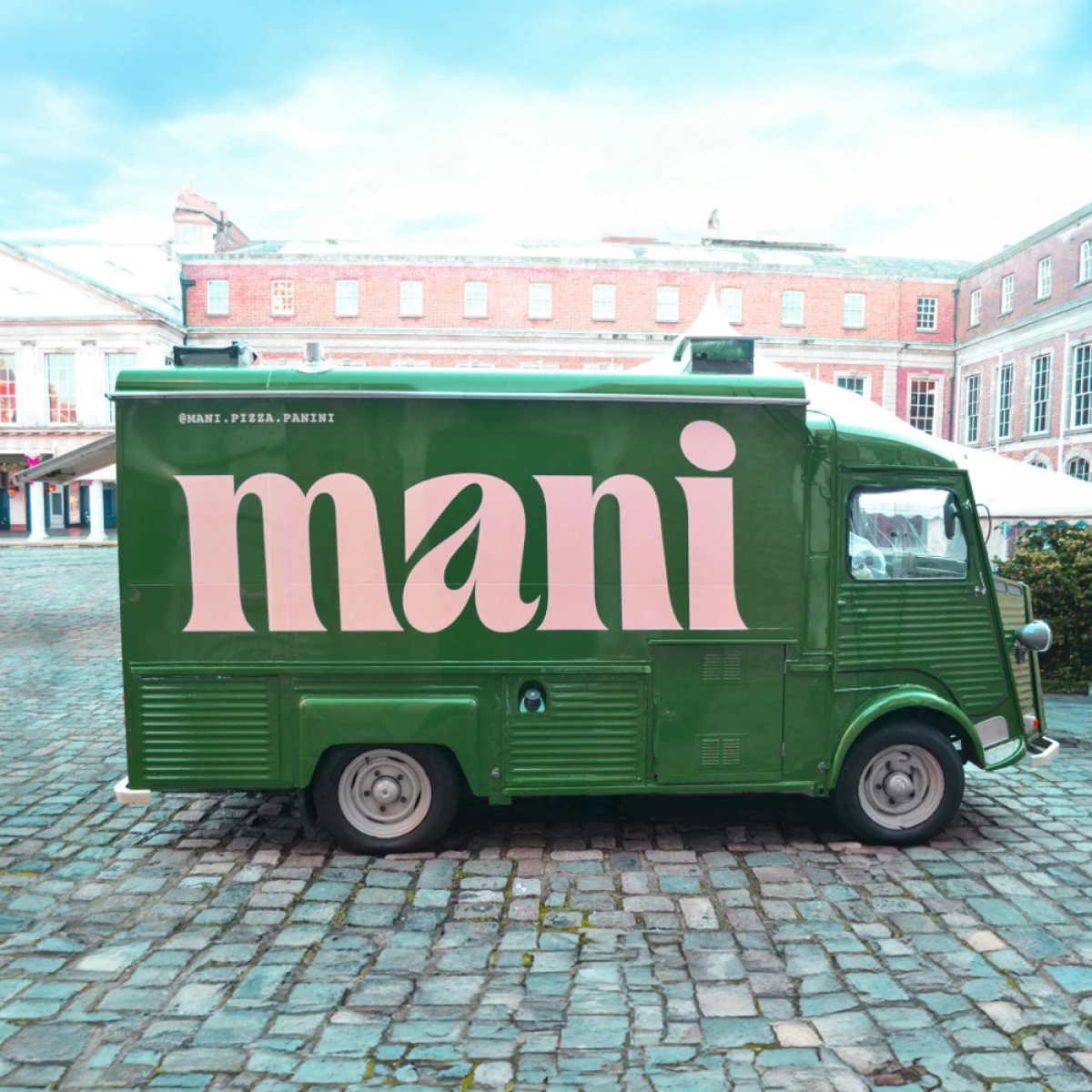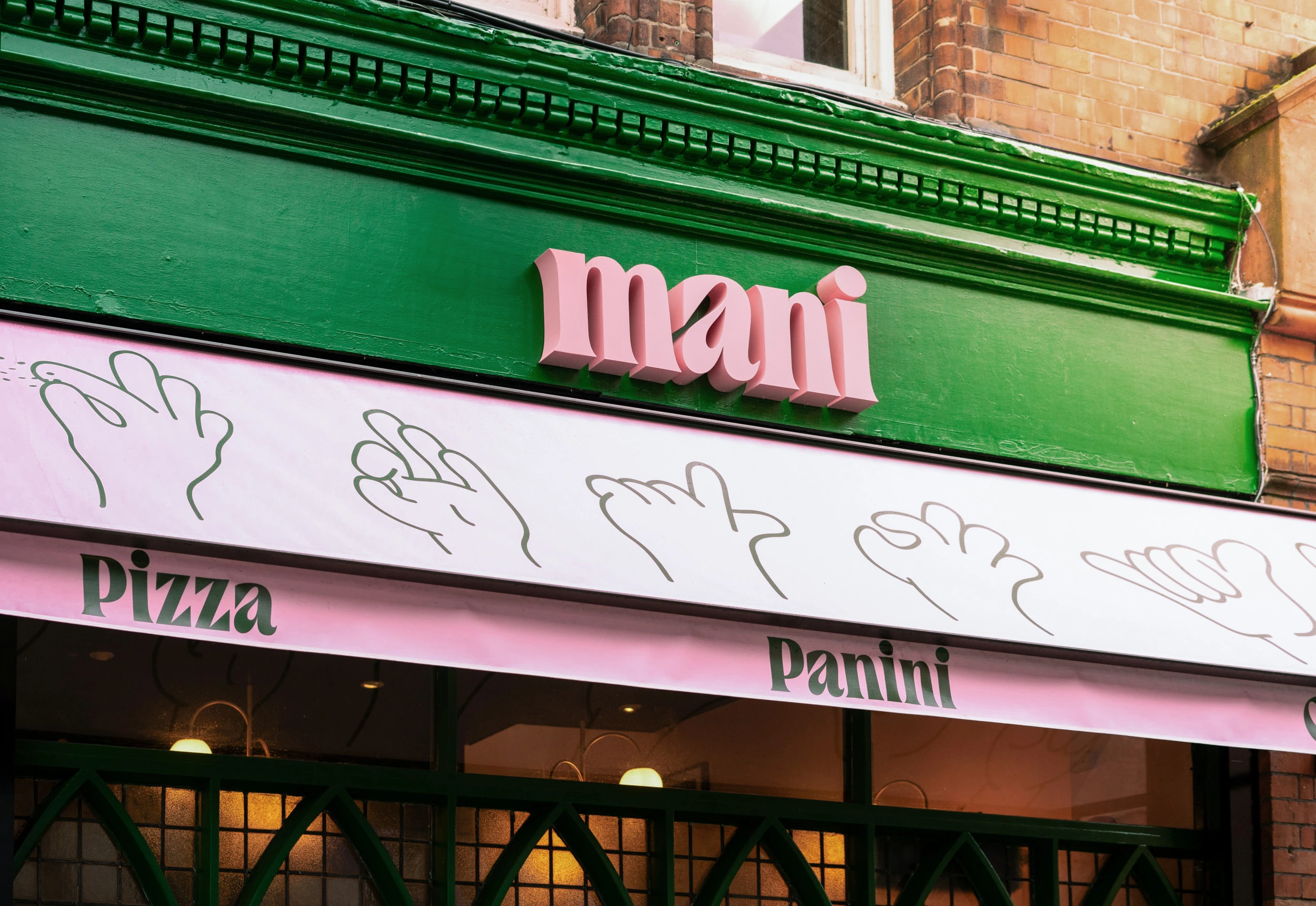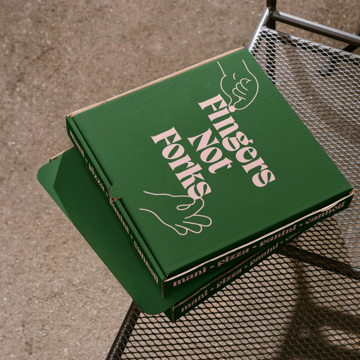 Mani is the latest brainchild from Ciaran at Catch Events. Ciaran engaged us to help develop an identity for a new concept around Roman Style Pizza and Panini. Mani, meaning fingers in Italian, is all about good food, eaten on the go. Food is prepared, eaten and cut by hand, the tradional Al-Taglio way.Â