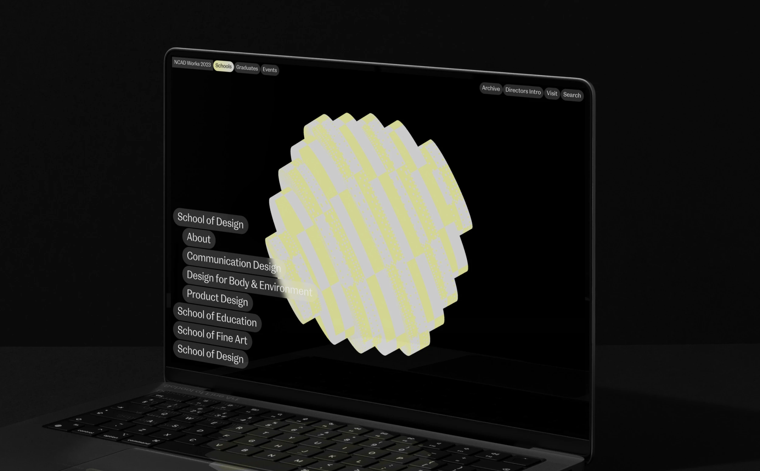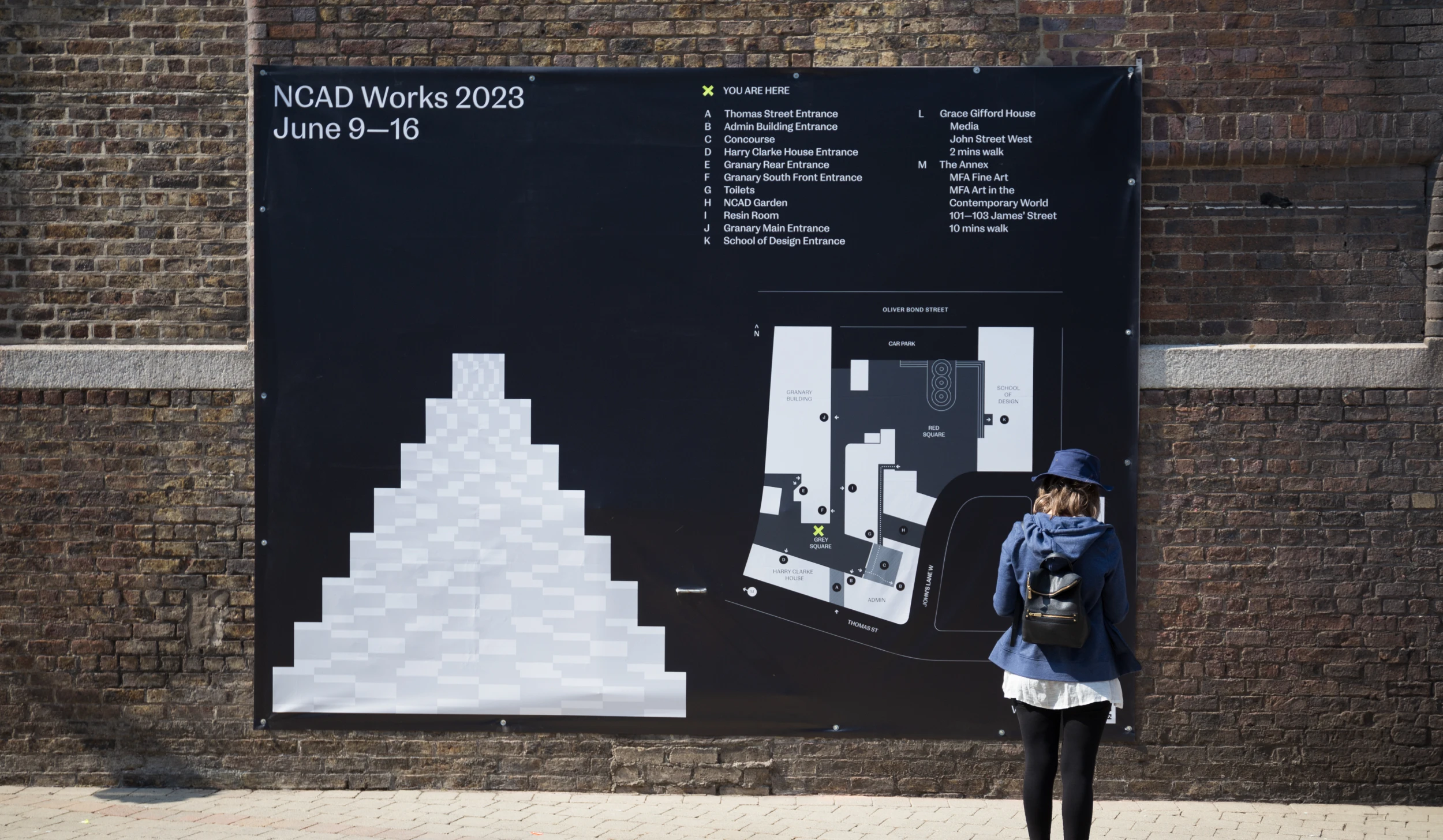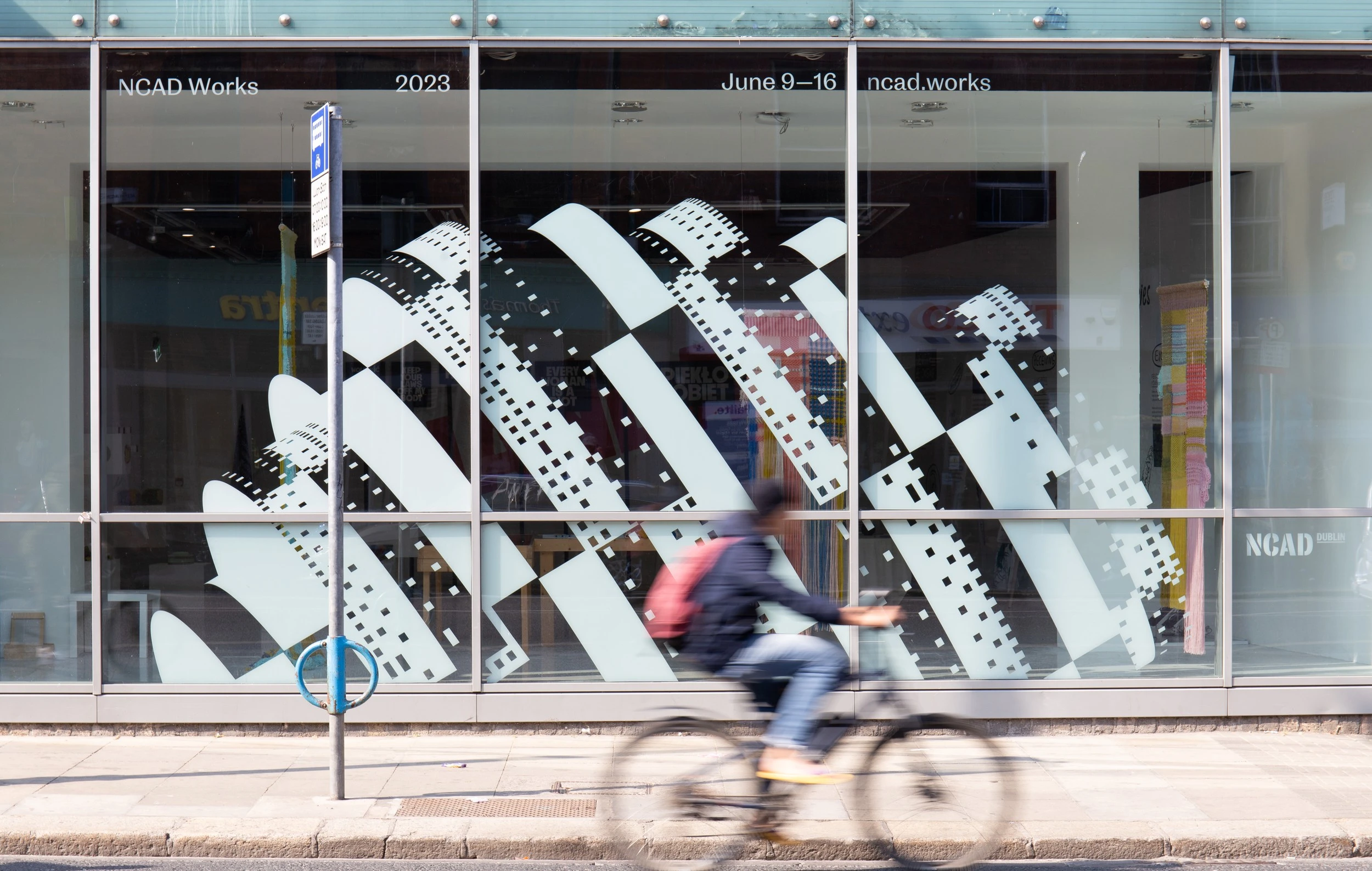 NCAD Works 2023's visual identity incorporates NCAD's bespoke Spenser typeface, a colour palette of black, white, grey, and an accent colour, all brought to life through the use of simple shapes. Initially, the four schools of NCAD served as inspiration for the shapes.