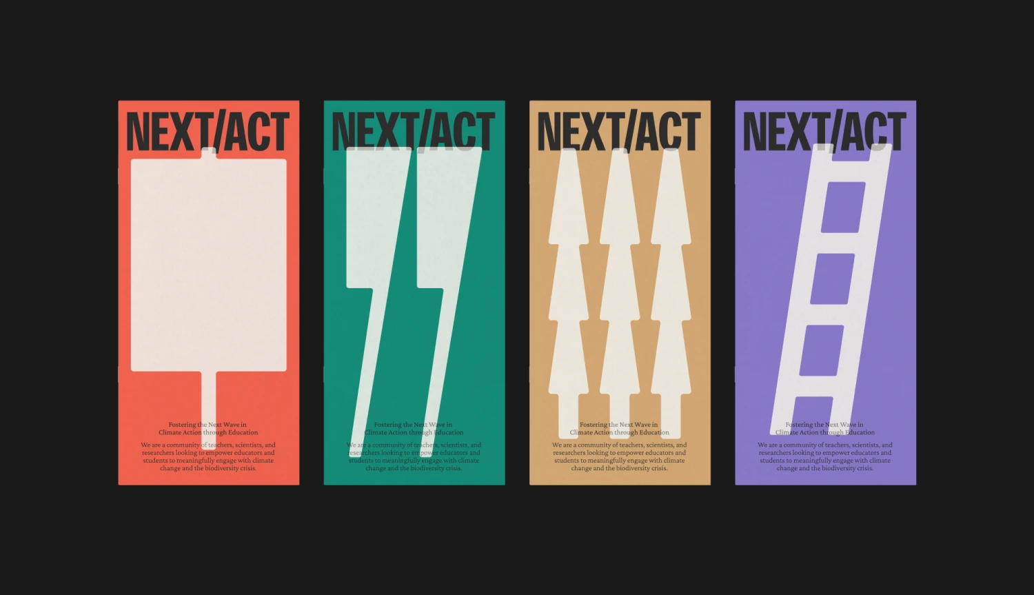 Inspired by the graphics of protest placards, the Next Act branding pairs bold typography and colour, with white ‘overprinted’ illustrations to create an aesthetic tone that is assertive and academic, while remaining accessible and optimistic.